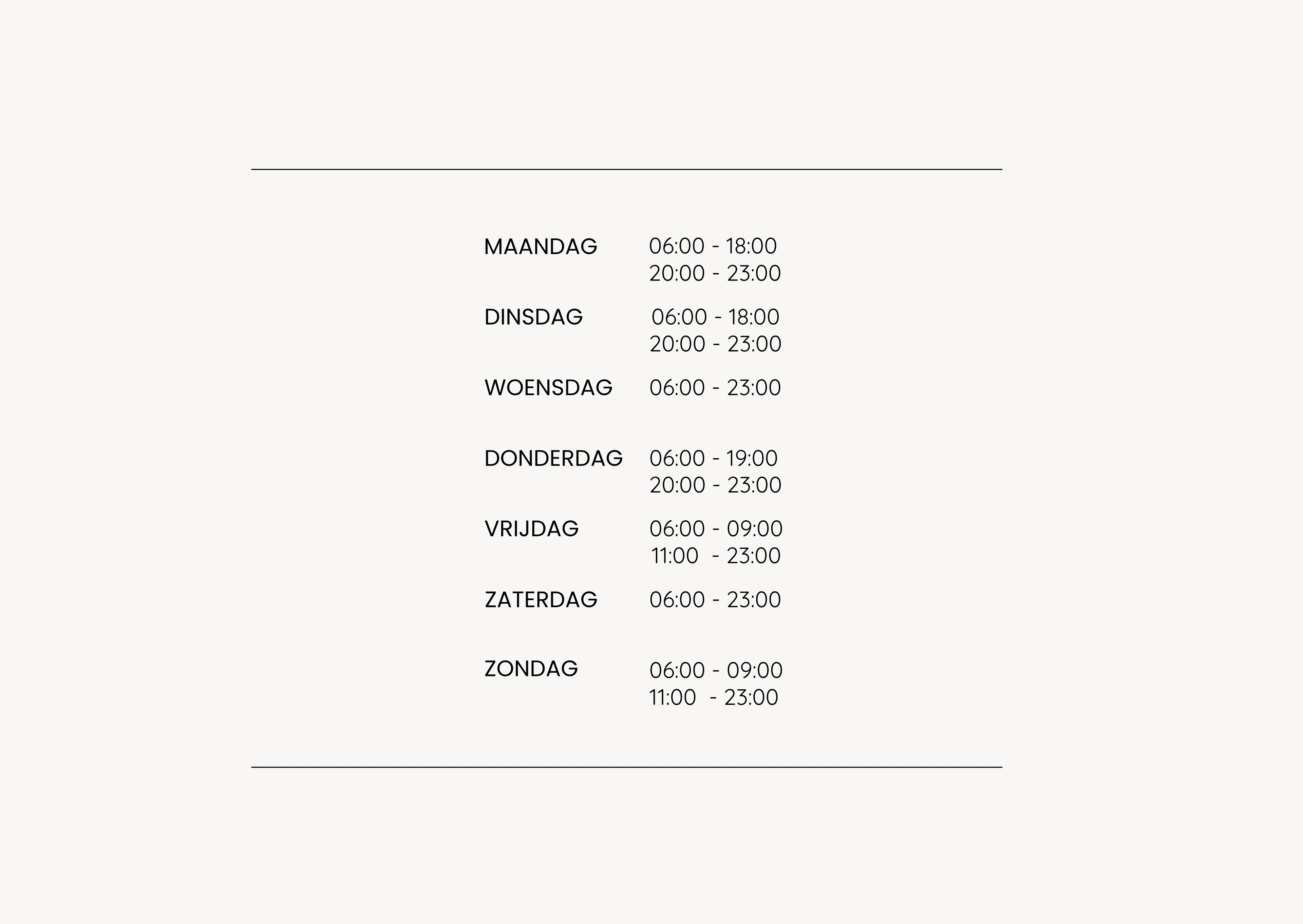 Onze exclusieve, onbemande women’s only gym is 7 dagen per week geopend van 06:00 tot 23:00 uur. Tijdens de Reformer Pilates-lessen is de gym gesloten voor vrij trainen om volledige rust en focus te waarborgen.